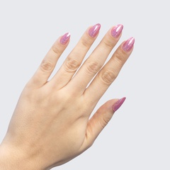 Bubble-gum pink. Muted. Medium. Iridescent shimmer. Opaque. Cool undertone.